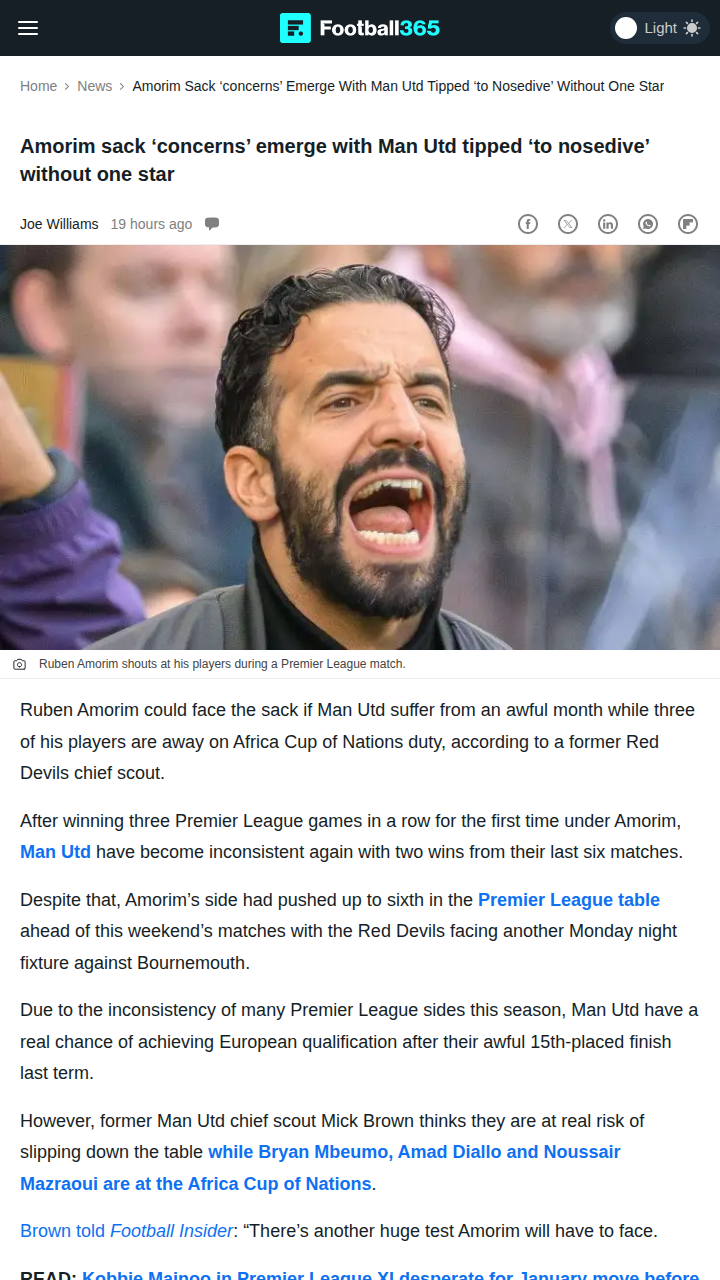 Maurice Miller+FollowRed Devils’ Right Flank Crisis LoomsTough times ahead for Amorim and the Red Devils! With Bryan Mbeumo, Amad Diallo, and Mazraoui set for AFCON duty, United’s right side is looking dangerously thin. Ex-chief scout Mick Brown warns that losing Mbeumo’s pace and drive could send United into a nosedive. Amorim’s got to work some magic to keep the Euro dreams alive. Can the squad step up, or will this be the turning point? #Sports #Soccer #ManUtd00Share