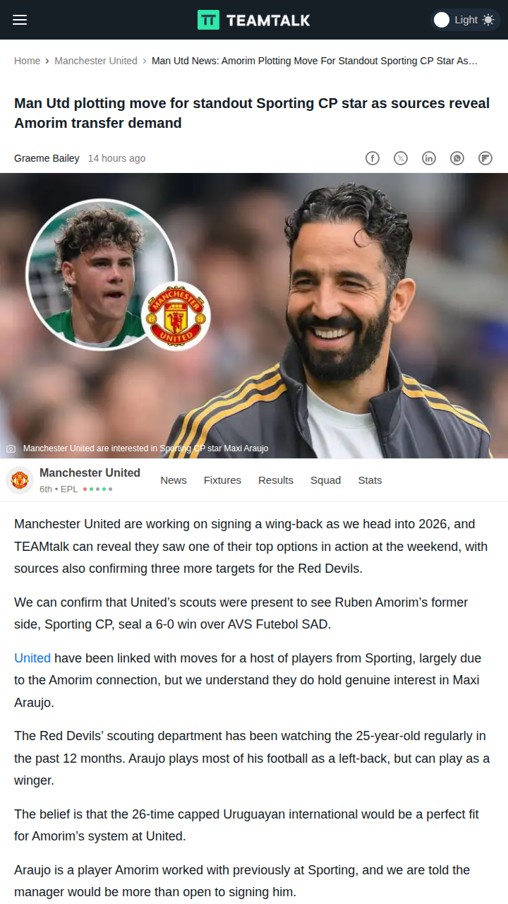 Charles Mills+FollowRed Devils Eye Sporting’s Maxi AraujoLooks like the Red Devils are seriously considering a swoop for Maxi Araujo, who just bagged a brace in Sporting’s 6-0 rout. With Amorim pushing for more attacking wing-backs, Araujo’s versatility and history with the boss make him a prime target. Given Sporting’s strong negotiating position, this could be a big-money move. Would you back this transfer, or do you prefer United chase other left-sided options? #Sports #Soccer #ManUtd00Share