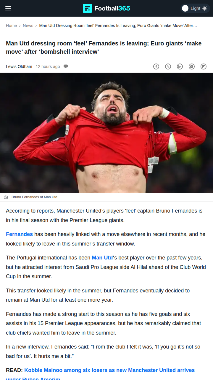 Jillian Morse+FollowBruno's Bombshell: Is This His Last Man Utd Season?Red Devils fans, are we witnessing the final chapter of Bruno Magic at Old Trafford? After his candid interview, the dressing room buzz is that our captain could be Bayern-bound next season. Despite being our top performer, Bruno says the club was open to him leaving last summer. With Bayern Munich reportedly making a move, could this be the end of an era? Let’s hear your thoughts—will Bruno stay loyal or chase new glory? #Sports #Soccer #ManUtd00Share