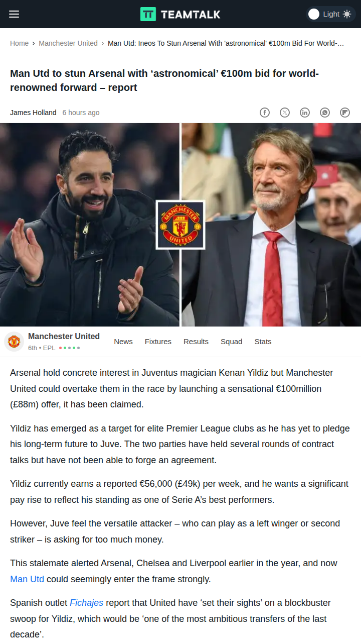 Timothy Thompson+FollowRed Devils Eye Yildiz in Arsenal ShowdownHuge transfer drama brewing! The Red Devils are reportedly preparing a jaw-dropping €100m bid for Juve’s rising star Kenan Yildiz, aiming to leapfrog Arsenal in the race. With contract talks stalling in Turin, Yildiz’s future is up for grabs—and United’s ‘astronomical’ offer could shake up the Premier League’s pecking order. Could this be the next big rivalry twist between United and Arsenal? #Sports #Soccer #ManUtd00Share