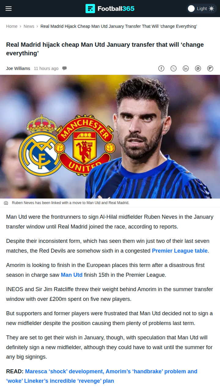 watkinsross+FollowMadrid Crash Man Utd’s Neves PartyJust when it looked like the Red Devils were finally set to fix their midfield woes with Ruben Neves, Los Blancos have swooped in to shake things up. Real Madrid’s late entry into the race for Neves could totally change the January transfer window. United fans, do you think Sir Jim and INEOS can outbid Madrid, or is this another classic Galacticos hijack? #Sports #Soccer #ManUtd00Share