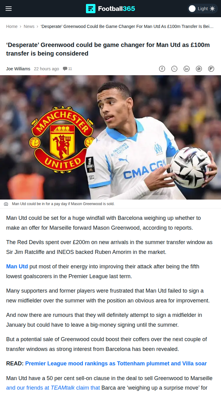 Tara Moran+FollowGreenwood’s £100m Saga: Barca Eyes Red DevilBig news brewing in the transfer market! Word is Barcelona are seriously considering a blockbuster move for Mason Greenwood, who’s been lighting it up at Marseille. With Marseille reportedly slapping a £100m price tag on the former Red Devil, this could be a game-changer for United’s summer plans—especially with that juicy 50% sell-on clause. If the Catalans pull the trigger, United’s midfield rebuild could get a massive boost. Thoughts on Greenwood’s evolution and potential Ballon d’Or talk? #Sports #Soccer #ManUtd00Share