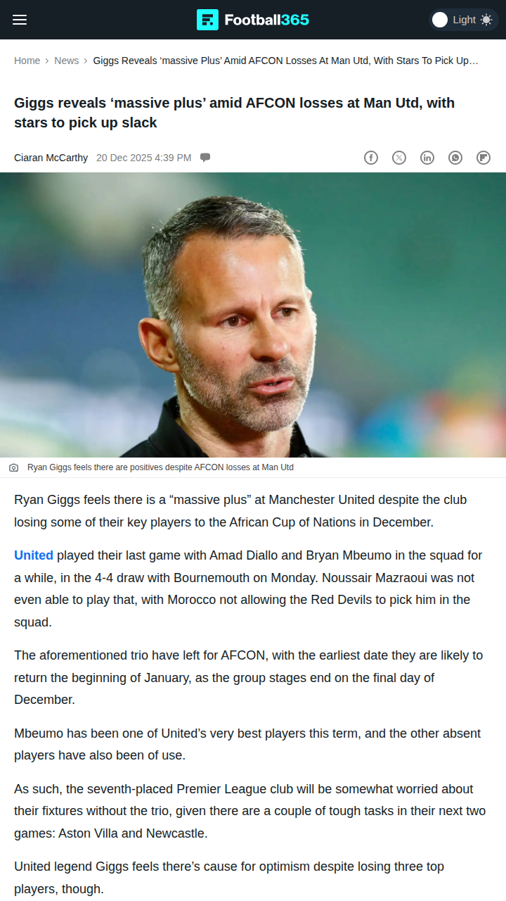 Maurice Miller+FollowAFCON Hits Red Devils—Can Mount Step Up?With Amad, Mbeumo, and Mazraoui off to AFCON, the Red Devils are missing some serious firepower. But United legend Giggs says there’s a silver lining: Mason Mount is back and finally showing his Chelsea form. With Martinez and Sesko returning too, there’s hope the squad can weather this tough stretch against Villa and Newcastle. Still, losing Mbeumo—our top threat—hurts. Can Mount and the lads fill the gap? Let’s hear your thoughts, Reds! #Sports #Soccer #ManUtd00Share