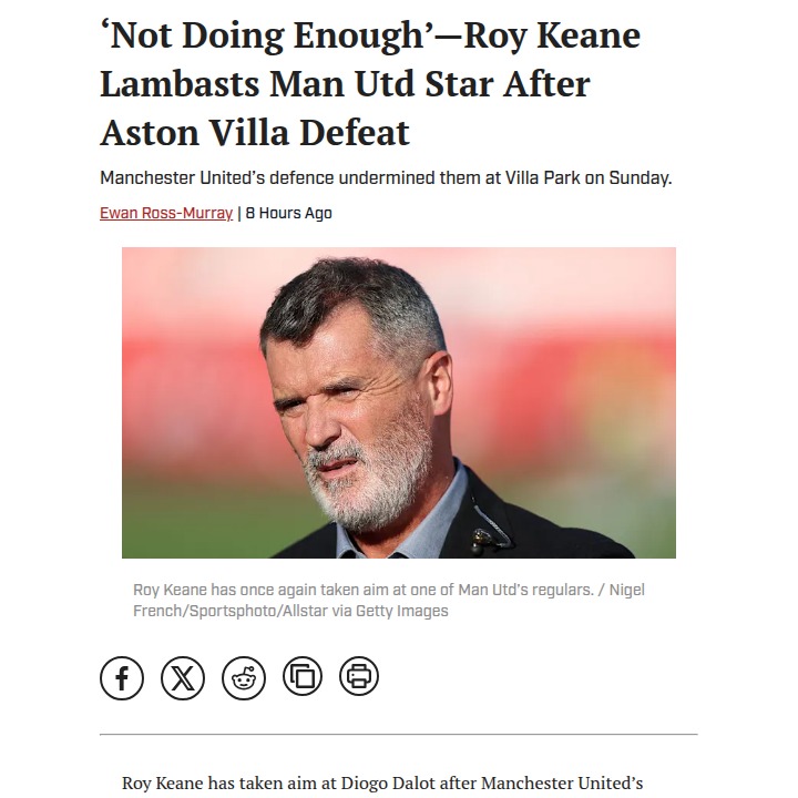 Charles Mills+FollowKeane Slams Dalot After Villa Park LossTough day for the Red Devils at Villa Park as Morgan Rogers put on a show and United slipped to their sixth defeat of the season. Roy Keane didn’t hold back post-match, calling out Dalot for not doing enough defensively—especially on both Villa goals. With injuries piling up at the back, can United’s defense step up, or will these motivation issues linger? What do you think—was Keane too harsh or spot on? #Sports #Soccer #ManUtd00Share