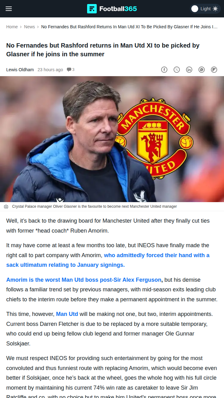 Allison Travis+FollowGlasner in Pole for Red Devils Hot Seat?Eagles boss Oliver Glasner is now the frontrunner to take over at Old Trafford, with the United board reportedly favoring his tactical nous and Premier League success. Word is, Glasner was tipped off about being on the Red Devils’ shortlist even before Amorim’s exit, influencing his decision to turn down new Palace deals. Could Glasner’s counter-attacking style be the answer to United’s search for stability? Let’s hear your thoughts, Reds! #Sports #Soccer #ManUtd00Share