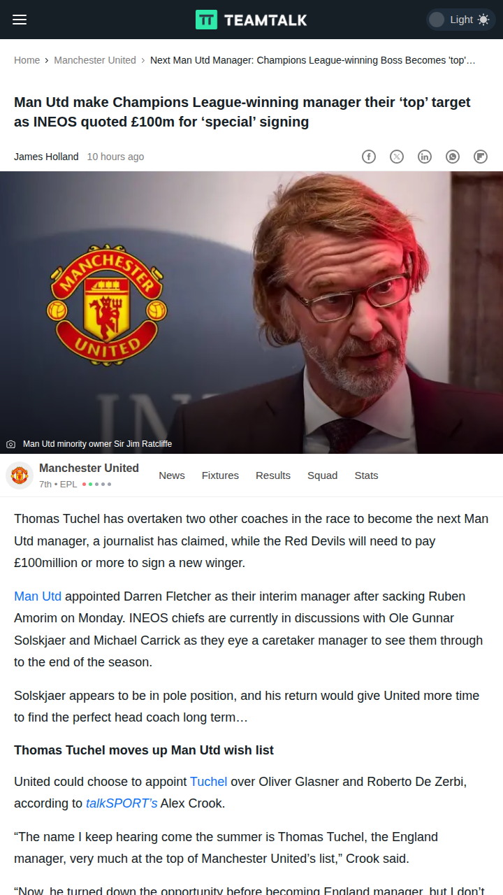 Maurice Miller+FollowTuchel Tops Red Devils’ Manager WishlistBig news from Old Trafford! Word is that Thomas Tuchel, the Champions League-winning tactician, has leapfrogged De Zerbi and Glasner as the Red Devils’ prime target for the manager’s seat. INEOS is serious about bringing in a proven winner, but with a £100m+ price tag on their winger wish list, it’s clear United are going all-in. Will Tuchel’s Chelsea magic translate to United glory? Let’s hear your thoughts, Reds! #Sports #Soccer #ManUtd00Share