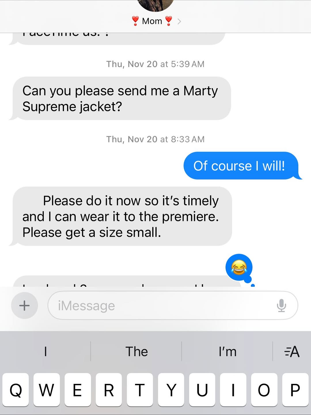 taylornoah+FollowTimothée Chalamet’s Mom Wants the Marty Supreme Jacket!Timothée Chalamet’s new movie Marty Supreme is already viral, but the real star? Those retro ‘Marty Supreme’ jackets everyone’s rocking—including celebs like Tom Brady and the Biebers. Even Timmy’s mom texted him for one, and he posted the receipts! Proof that no matter how famous you get, you’re never off merch duty for your mom. Now I need to see them twinning at the premiere. Is this the hottest movie merch of the year or what? #Beauty #TimothéeChalamet #MartySupreme00Share