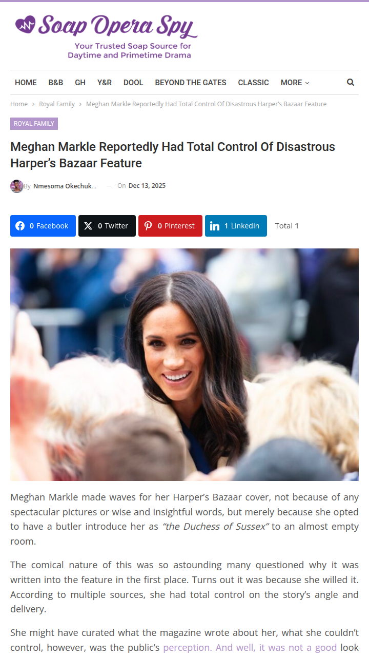 James Hall+FollowMeghan’s Harper’s Bazaar Cover Drama 🤯Meghan Markle’s Harper’s Bazaar cover is causing a stir, not for the glam, but for the bizarre choice to have a butler introduce her as “the Duchess of Sussex” to an empty room. Word is, Meghan had full control over the story’s angle and edits. Fans are split—some say it’s her right, others call it pure PR madness. Did she go too far with the royal theatrics? #Entertainment #Celebrity #MeghanMarkle03Share