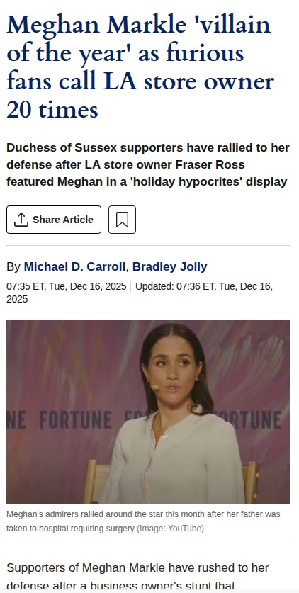 Christian Jones+FollowMeghan Markle Drama Hits LA Storefront 😱Meghan Markle fans are NOT having it after LA’s Kitson store put her in their ‘holiday hypocrites’ window, calling her the ‘villain of the year’ with a ‘Montecito Diva’ Santa hat. The fandom is split—some say it’s unfair targeting, others think it’s justified after her royal drama. One superfan even called the store 20 times! Is this crossing the line or just celebrity culture? #Entertainment #Celebrity #MeghanMarkle125Share