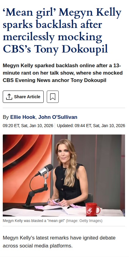 Angelica Mclaughlin+FollowMegyn Kelly's 'Mean Girl' CBS Drama 💥Did Megyn Kelly go too far mocking Tony Dokoupil for crying on CBS? Her 13-minute rant about his emotional segment has fans calling her a 'mean girl' and accusing her of hypocrisy. Some say she's exposing the 'feminization of the newsroom,' while others think she's just stirring up drama for clicks. Is Megyn being real or just playing the villain? The internet is divided! #Entertainment #Celebrity #MegynKelly00Share