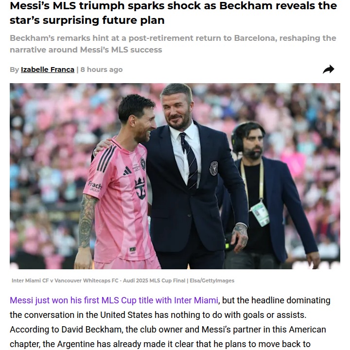 Allison Travis+FollowMessi’s MLS Cup Win: Beckham Drops Barca BombWow, what a ride! The GOAT just led Inter Miami to their first MLS Cup, racking up a mind-blowing 35 goals and 24 assists in just 34 games. But here’s the twist: Beckham revealed that King Leo’s heart still beats for Barcelona, hinting Messi plans to return to Camp Nou after hanging up his boots. Miami fans, enjoy the Messi magic while it lasts—this legend’s story in the U.S. might be shorter than we hoped! #Sports #Soccer #Messi00Share