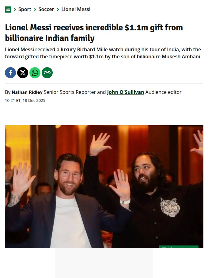 Maurice Miller+FollowMessi’s $1.1M Watch Gift Sparks Fan ChaosGOAT fans, did you see the madness in Kolkata? King Leo’s ‘GOAT tour’ in India was wild—85,000 packed Salt Lake, but Messi only stayed 20 minutes before chaos broke out. Fans were furious they missed him, tearing out seats and tossing stuff onto the pitch! But the real headline? Messi got a $1.1M Richard Mille watch from the Ambani family—only 12 exist! Talk about legendary moments on and off the field. #Sports #Soccer #Messi00Share