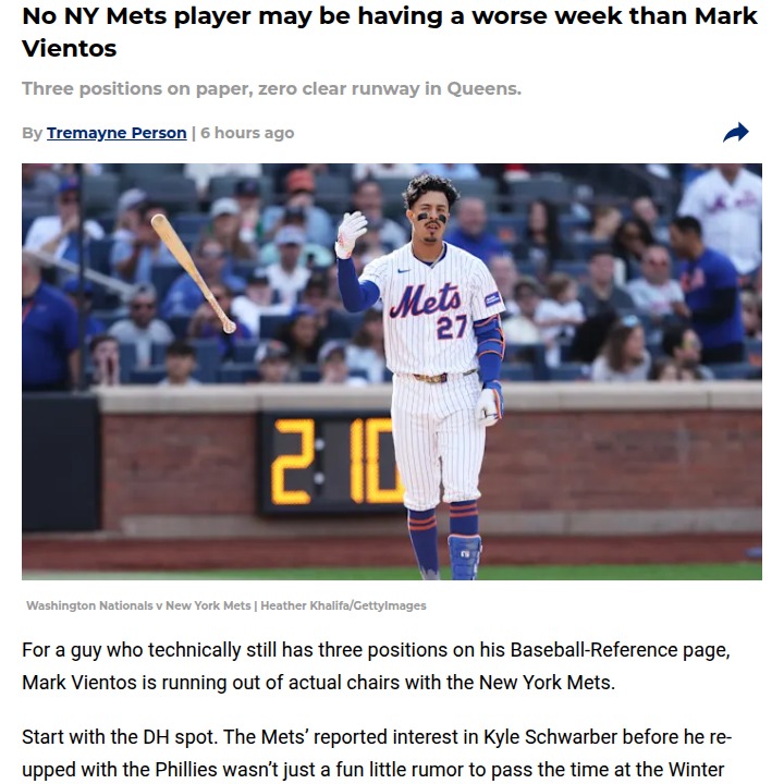 Andrea Castillo+FollowMets’ roster shakeup leaves Vientos boxed outMark Vientos can’t catch a break with the Mets right now. As the team openly looks for more power at DH and commits to Brett Baty at third, Vientos finds himself squeezed out of every position he once called home. Even first base isn’t a sure thing, with Pete Alonso trade rumors swirling but no real movement. Vientos’ numbers last season didn’t force the Mets’ hand, and now he’s stuck waiting to see if he’ll be a bench bat, trade chip, or just left in limbo. What do you think—should the Mets give him another shot, or is it time to move on? #Sports #Baseball #Mets00Share
