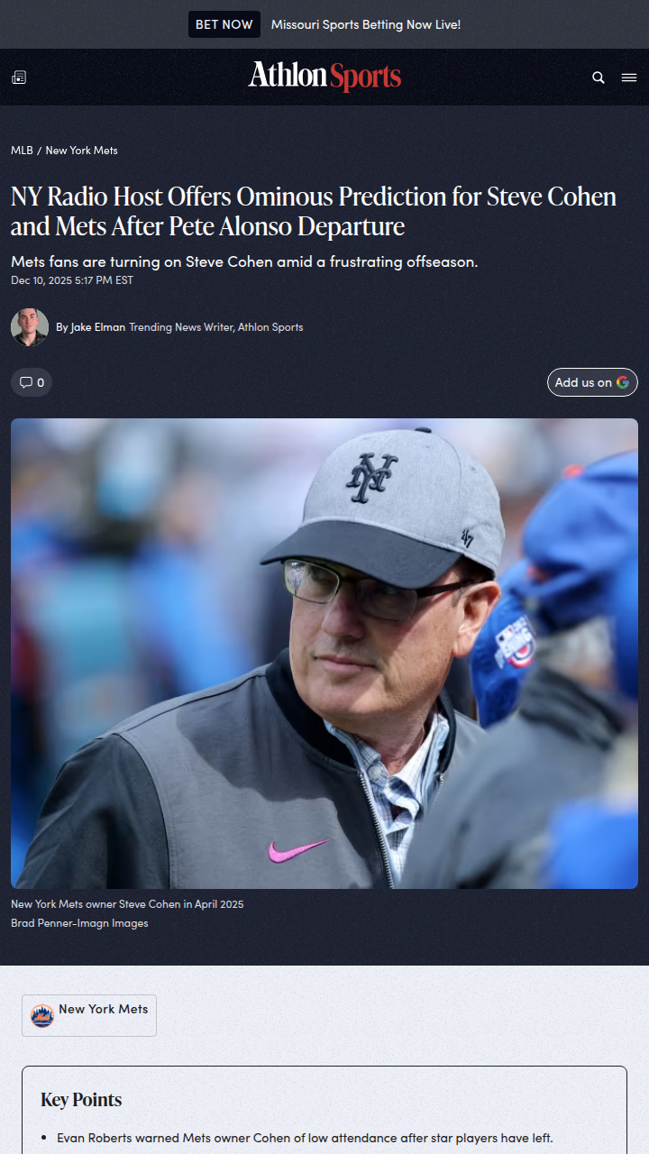 Tammy Sellers+FollowMets fans brace for empty seats after Alonso, Díaz exitsLosing Pete Alonso to the Orioles and Edwin Díaz to the Dodgers has left Mets fans stunned—and WFAN’s Evan Roberts isn’t holding back. He’s warning owner Steve Cohen that Citi Field could look emptier than ever next season, especially after last year’s record attendance. Fans showed up when Cohen spent big, but now, with stars leaving and few new faces, the mood is shifting fast. Do you think Mets fans will actually boycott Opening Day, or will loyalty win out? Let’s hear your take on what’s next for the team and its fanbase. #Sports #Baseball #Mets32Share