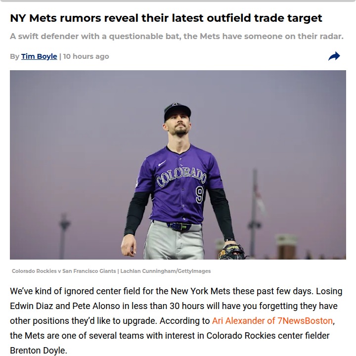 Renee Ramirez+FollowNY Mets eye Rockies’ Brenton Doyle for center fieldNY Mets fans, here’s a twist: the team is seriously looking at Rockies’ Brenton Doyle as a new center field option. Doyle’s a two-time Gold Glove winner, but his bat hasn’t traveled well outside Coors Field—he’s hitting just .201 on the road. The Mets would be banking on his defense, but with his salary close to Tyrone Taylor’s, is this really an upgrade? Plus, with left field still a bigger need, some are questioning if this is the right move. Would you rather see the Mets stick with Taylor or roll the dice on Doyle? #Sports #Baseball #Mets00Share