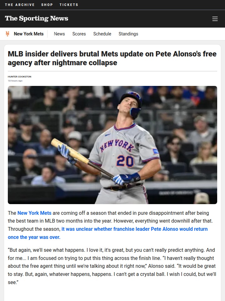 Kimberly Moore+FollowMets fans brace for life without Pete AlonsoPete Alonso looks set to leave the Mets after opting out of his contract, and insiders say there’s a better-than-even chance he won’t be in a Mets uniform on Opening Day. With Brandon Nimmo already traded and Jeff McNeil possibly next, it feels like the end of an era in Queens. Some say the clubhouse vibe has been off, and maybe Alonso just wants a fresh start. What do you think this means for the Mets’ future? Are we witnessing a full rebuild, or is there still hope for a turnaround? #Sports #Baseball #Mets00Share