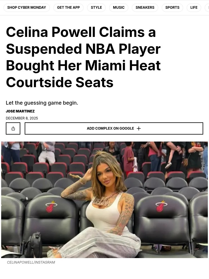 Oscar Gonzalez+FollowCourtside drama: Suspended NBA player linked to Miami Heat seatsTurns out, those prime Miami Heat courtside seats aren’t just for the rich and famous—sometimes, they’re courtesy of a suspended NBA player! Celina Powell let it slip on a Twitch stream that her VIP access comes from a player who’s currently off the court, sparking wild guesses online. While many pointed fingers at Terry Rozier, Powell insists it’s not him. The mystery has fans buzzing: Who’s really behind these tickets, and what does it say about the perks and connections in pro sports? Let’s hear your theories—who do you think it is, and should suspended players still have this kind of influence? #Sports #Basketball #MiamiHeat01Share