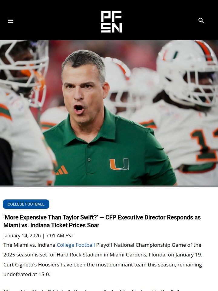 Michael Pitts+FollowMiami vs Indiana: Ticket Prices Break Records!Can you believe the Miami Hurricanes and Indiana Hoosiers are set to clash for the CFP National Championship—and the ticket prices are through the roof? Some seats are going for more than a Taylor Swift concert! With the Hoosiers undefeated and the Canes playing for a title at home, this matchup is drawing Super Bowl-level hype. Will the Hoosiers’ crimson army take over Hard Rock, or will the Canes’ home crowd make the difference? #Sports #Football #MiamiVsIndiana00Share