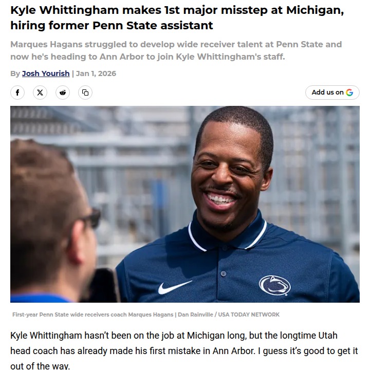 Amy Williams+FollowMichigan Football’s First Whiff Under Whittingham?Wolverine Nation, what do we think of Coach Whittingham’s first big move in Ann Arbor? He just brought in Marques Hagans—fresh off a rough stint with the Nittany Lions’ wideouts—to help coach Michigan’s receivers. Penn State fans know Hagans’ WRs were nearly invisible in the CFP, and now he’s tasked with sparking Michigan’s offense. Is this a risky call, or will a fresh start turn things around for the Maize and Blue? #Sports #Football #MichiganFootball00Share