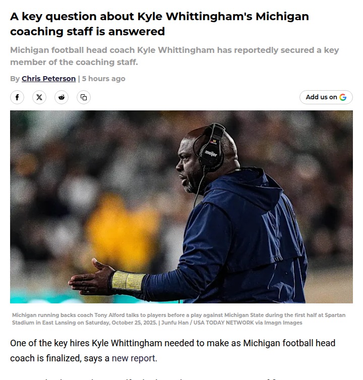 John Camacho+FollowMichigan football keeps key recruiter AlfordMichigan football fans, big news: Tony Alford is staying on as running backs coach under Kyle Whittingham. Alford’s return is a game-changer—not just because he’s a top recruiter (he landed five-star Savion Hiter), but also for his ability to get huge production from his backs. Three different players had 100+ yard, 3-TD games this season! With Alford sticking around, it looks like Michigan will keep Hiter, too. More staff moves are expected after the bowl games, but this first domino falling should boost confidence in Whittingham’s new era. What do you think of the staff so far? #Sports #Football #MichiganFootball10Share