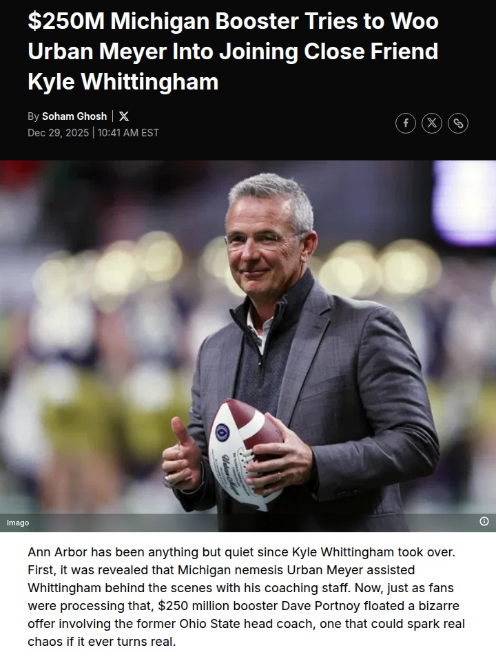 Michael Pitts+FollowMichigan’s $250M booster stirs up Urban Meyer dramaMichigan football just got a wild twist—$250 million booster Dave Portnoy openly tried to recruit Urban Meyer, the legendary Ohio State coach, to join Kyle Whittingham’s staff in Ann Arbor. Imagine the chaos if Meyer, a die-hard Buckeye, ever crossed over to help Michigan! On a recent podcast, Portnoy floated the idea directly to Meyer, who quickly shot it down, saying he’d never wear Maize and Blue. Still, the thought of such a rivalry shake-up has fans buzzing. Would you ever welcome a rival legend to your team if it meant more wins? #Sports #Football #MichiganFootball00Share