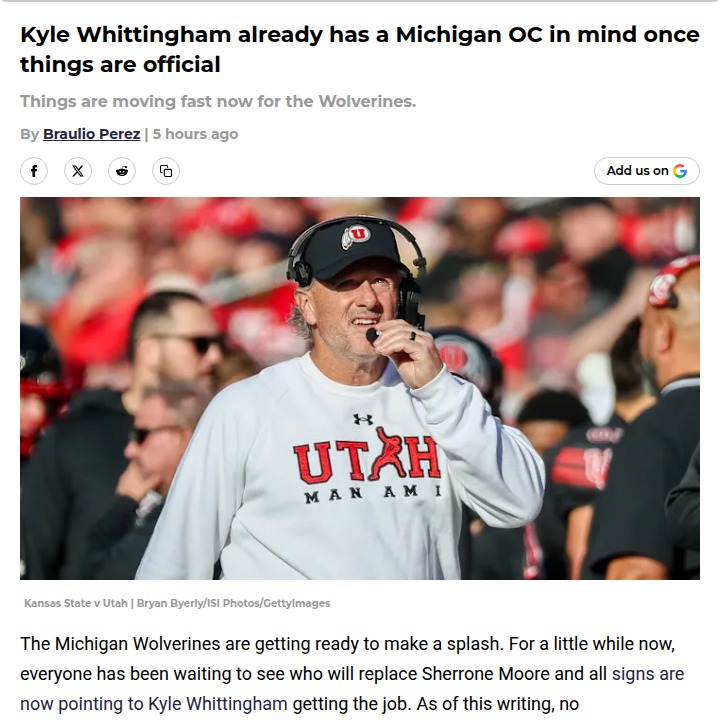 Jeffrey Armstrong+FollowWhittingham Heads to Michigan: What’s Next?Big news, Wolverines fans—Kyle Whittingham is set to become Michigan’s 22nd head coach, ending weeks of speculation. The longtime Utah boss, known for keeping things clean and steady, steps in after Sherrone Moore’s exit. Some are questioning if Whittingham was the top choice, but with his experience and no drama in his past, he’s a solid pick. The real question: will he coach Utah’s bowl game, or is he already all-in for the Maize and Blue? #Sports #Football #MichiganFootball00Share