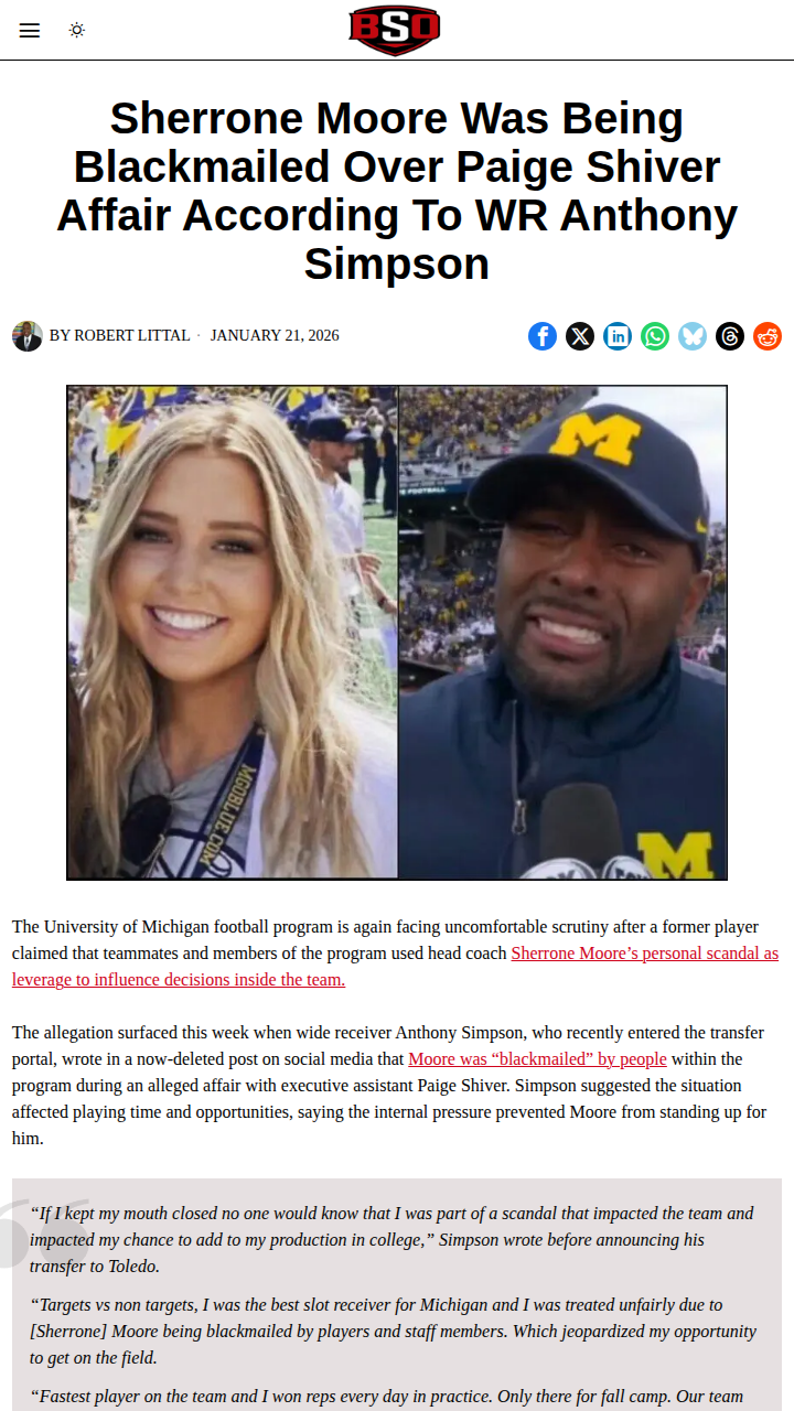 Jeffrey Armstrong+FollowMichigan football rocked by blackmail claimsAllegations of blackmail and unfair treatment are swirling around Michigan football after former player Anthony Simpson claimed he was benched because head coach Sherrone Moore was being blackmailed by players and staff. Simpson, who transferred out after one season, insists he was the fastest on the team and deserved more playing time, but says internal drama kept him off the field. Meanwhile, other former teammates are calling his story out as false. With Moore already fired for an unrelated scandal, the Michigan program is facing serious questions about what’s really happening behind the scenes. What do you think—just sour grapes, or is there more to this story? #Sports #Football #MichiganFootball00Share