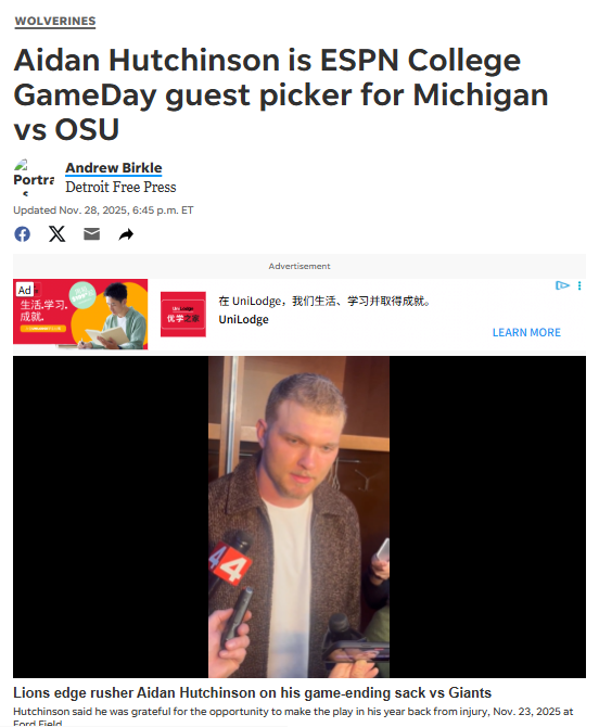 Aidan Hutchinson is back in Ann Arbor just in time for one of college football’s biggest rivalries—Michigan vs Ohio State. After suiting up for the Lions on Thanksgiving, Hutchinson will be ESPN College GameDay’s guest picker for Saturday’s clash. With the Buckeyes undefeated and Michigan fighting to keep playoff hopes alive, the stakes couldn’t be higher. Hutchinson’s energy and local pride are sure to fire up the crowd. How do you think his picks will go this year? And what’s your prediction for this epic matchup? #Sports #Football #MichiganVsOhioState