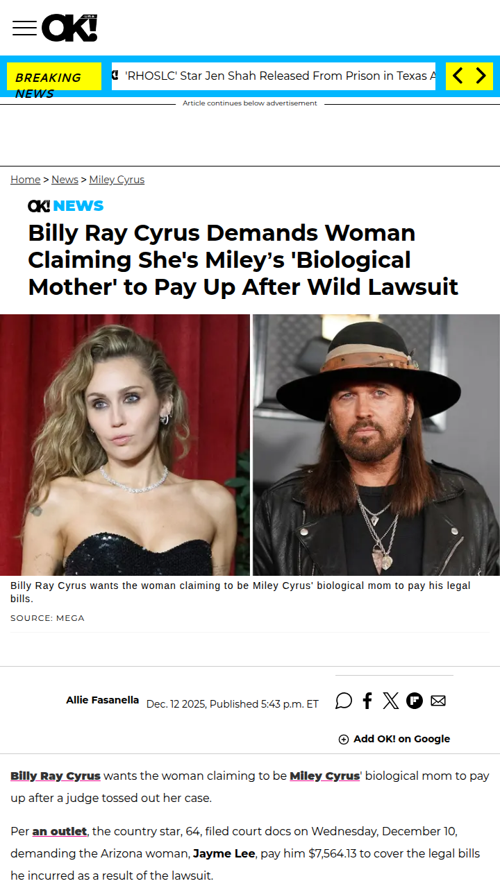 xpotter+FollowBilly Ray Fights Back in Miley Mom Lawsuit 💥Wild twist in the Cyrus family drama! After a woman claimed to be Miley’s biological mom and sued Billy Ray, the judge tossed the case—and now Billy Ray wants her to pay his $7,500+ legal bill. Fans are split: some say he’s right to fight back, others think it’s just fueling more chaos. Is this the wildest Miley rumor yet? #Entertainment #Celebrity #MileyCyrus00Share