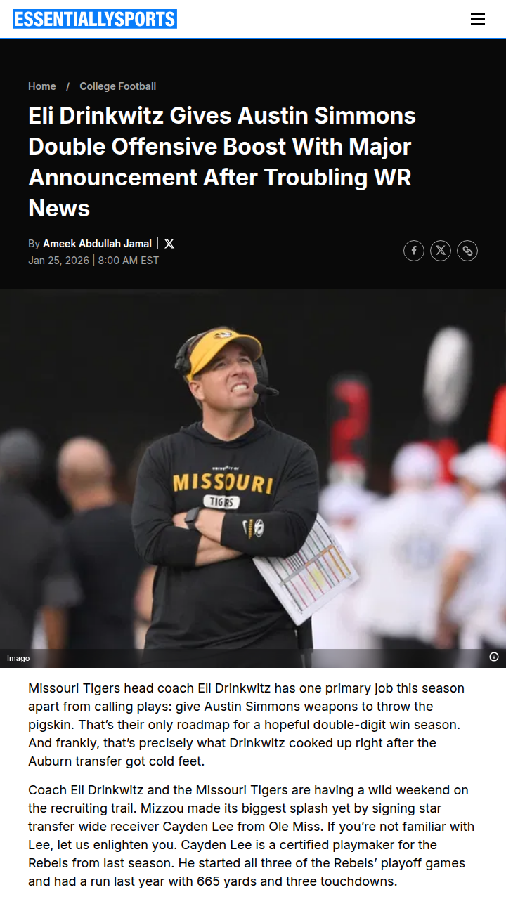 Chad Williams+FollowMizzou’s offense just got a major upgradeMizzou fans, get ready—Coach Drinkwitz just pulled off a game-changer for the Tigers’ offense. Star wide receiver Cayden Lee is coming in from Ole Miss, reuniting with QB Austin Simmons and instantly raising hopes for a 1,000-yard season. While this move shook up the receiver room (Auburn transfer Horatio Fields is out), the Tigers aren’t slowing down. Local phenom Preston Hatfield, who shattered state rushing records, is now committed for 2026. With a loaded backfield and top transfer class, Mizzou is suddenly a legit playoff contender. How do you feel about the new roster? Is this the year the Tigers break through? #Sports #Football #Mizzou00Share