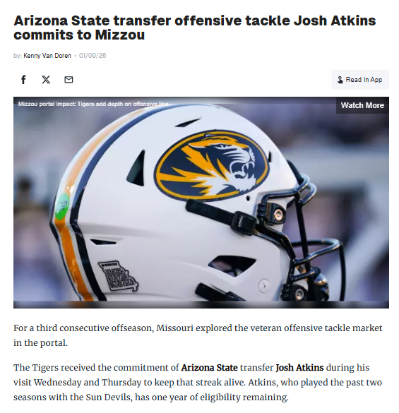 Christopher Hughes+FollowMizzou Snags Sun Devil Atkins for O-Line DepthBig news for the Tigers’ trenches! Mizzou just landed Josh Atkins, the ironman left tackle from Arizona State, out of the portal. Atkins brings a 39-game starting streak and solid pass-blocking chops to Columbia. With All-American Keagen Trost gone, could Atkins slide to right tackle and anchor the line with Cayden Green? This portal pickup could be a game-changer for Drinkwitz’s squad! #Sports #Football #Mizzou00Share