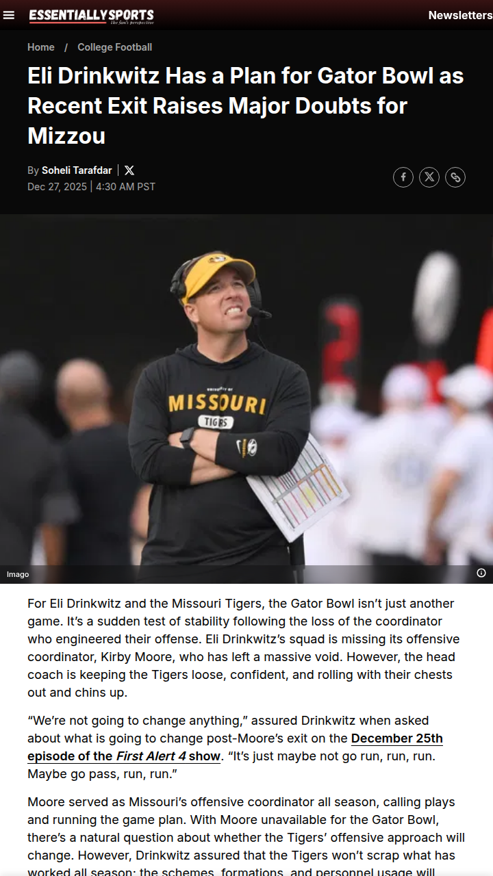 Amy Williams+FollowMizzou faces Gator Bowl test without MooreLosing offensive coordinator Kirby Moore right before the Gator Bowl has thrown a wrench into Mizzou’s game plan, but Eli Drinkwitz isn’t backing down. He’s keeping the Tigers confident and sticking to what’s worked all season—just with a few tweaks. Expect more early passes and less predictability as they take on Virginia’s top-ranked third-down defense. The Tigers’ run game has been strong, but their passing attack needs a spark. With new OC Chip Lindsey stepping in, all eyes are on how Mizzou adapts. Can the Tigers keep rolling, or will Virginia’s defense expose the cracks? Let’s hear your thoughts! #Sports #Football #Mizzou00Share