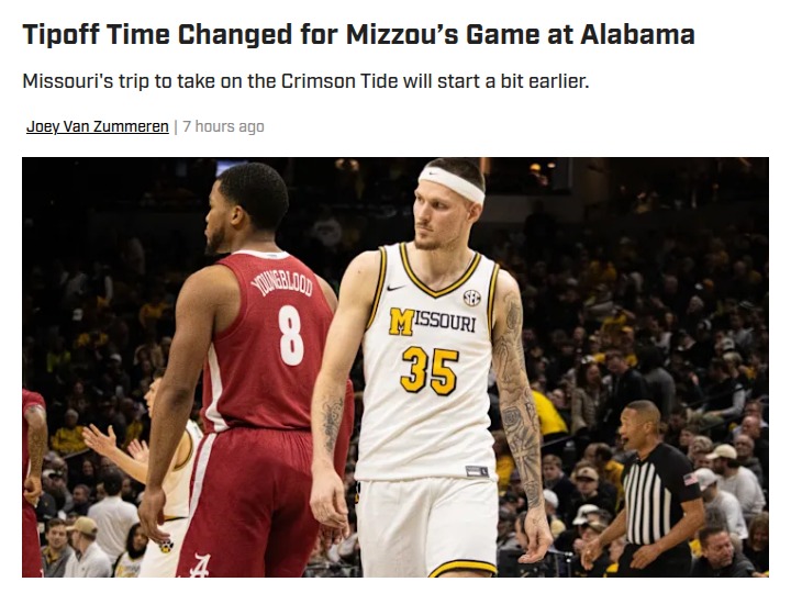 Nicole Obrien+FollowMizzou basketball tipoff time moves up!Mizzou fans, heads up—Tuesday’s big game at Alabama will now tip off at 7 p.m. instead of 8! That’s an hour earlier for your game day plans. The Tigers haven’t had much luck at Coleman Coliseum, winning just once in nine tries, but after last week’s wild buzzer-beater win over Oklahoma, anything feels possible. Alabama is coming off a tough home loss, so both teams have something to prove. Will this earlier start shake things up for Mizzou on the road? Let’s hear your predictions and pregame rituals! #Sports #Basketball #MizzouBasketball00Share