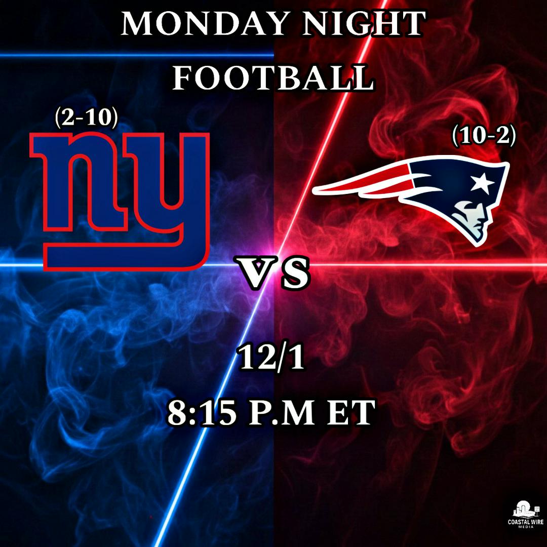 Coastal Wire Media+FollowMonday Night Football: Giants vs Patriots PreviewThe 10–2 Patriots enter tonight with one of the league’s most efficient defenses and a top-10 scoring offense, while the 2–10 Giants continue searching for stability on both sides of the ball. New England aims to tighten its grip on playoff seeding, but New York could shift the narrative with a rare upset if they capitalize on turnovers and control time of possession. High stakes for the Pats high opportunity for the Giants. Coastal Wire Media | All Rights Reserved | Est. 2025 #NFL #NFLNews #MondayNightFootball 2313Share
