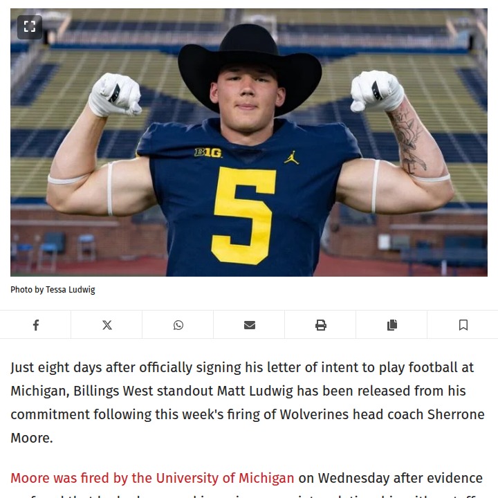 Amy Williams+FollowMontana’s top football star reopens recruitmentMatt Ludwig, Montana’s Gatorade Player of the Year and a Billings West standout, is back on the market after Michigan released him from his commitment. This comes just days after the Wolverines fired head coach Sherrone Moore for misconduct. Ludwig, a four-star tight end and the state’s top recruit, had planned to join Michigan early but now has his pick of top programs again. This sudden change could shake up college football recruiting—where do you think Ludwig should land next? Let’s hear your thoughts on how this impacts Montana athletes and the wider recruiting scene! #Sports #Football #MontanaFootball00Share