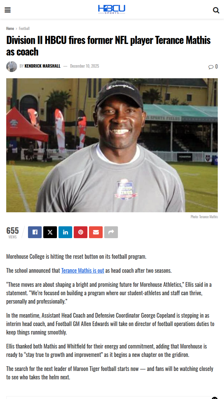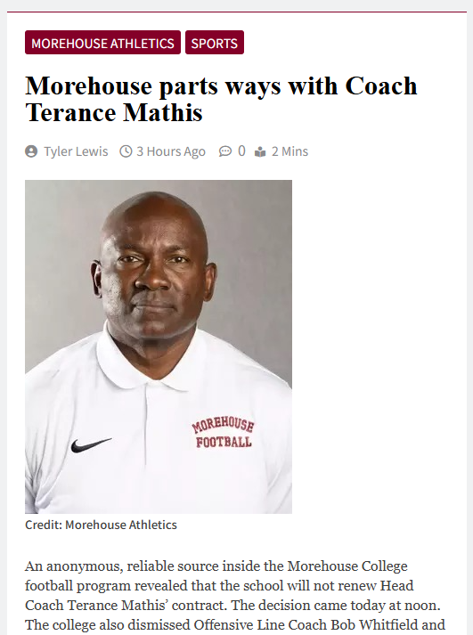 Michael Pitts+FollowBig shakeup for Morehouse footballMorehouse College football just made a bold move—Coach Terance Mathis, along with two other key staff members, are out. This comes right after the team’s best season since 2021 and increased national exposure at major HBCU events. Now, longtime assistant George Copeland is stepping in as interim head coach. For a program that’s seen three head coaching changes in four years, this decision raises a lot of questions about the direction and stability of Morehouse football. What do you think this means for the team’s future and the players who’ve been pushing for more opportunities? #Sports #Football #Morehouse00Share