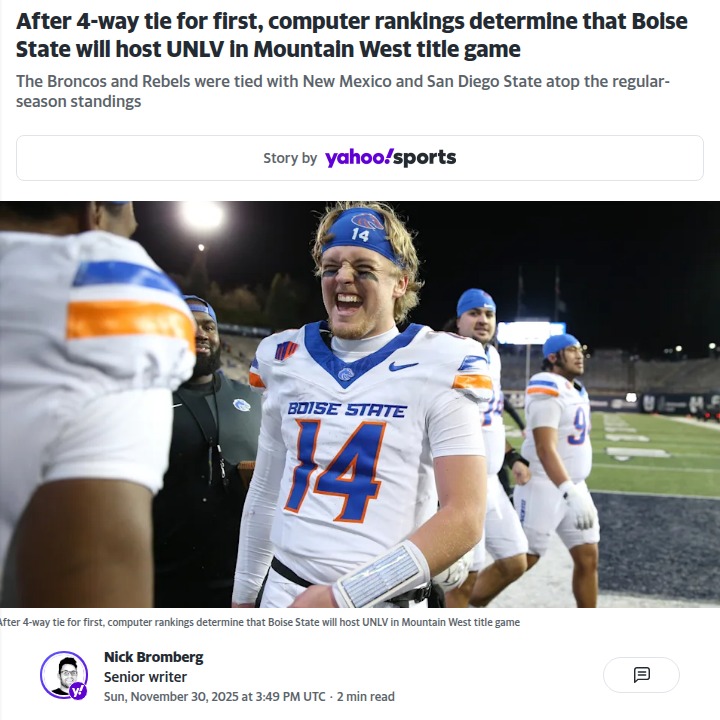 Amy Williams+FollowMountain West title game: Boise State hosts UNLVBoise State is set to host UNLV in the Mountain West championship after a wild four-way tie at the top of the conference. Instead of head-to-head matchups, computer rankings broke the deadlock, giving the Broncos home field advantage. New Mexico and San Diego State just missed out, despite big wins, showing how unpredictable college football can be. With so much riding on algorithms, do you think this is the best way to decide who plays for the title? Would you rather see a playoff or stick with the current system? #Sports #Football #MountainWest00Share