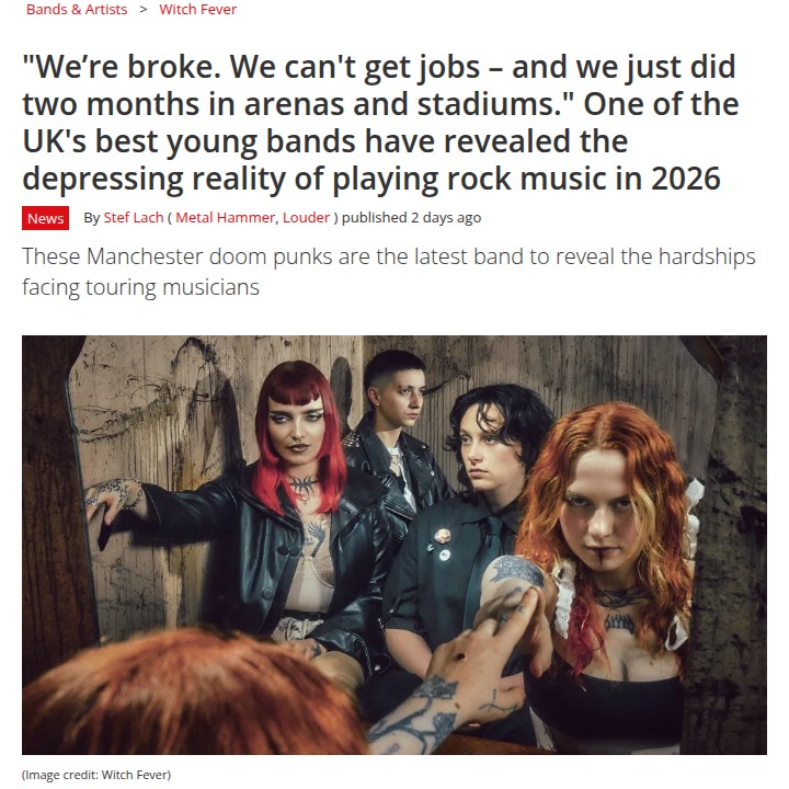 Cameron Frazier+FollowWitch Fever's Arena Tour Drama 😱How wild is it that Witch Fever just finished a massive arena tour with Volbeat, played Wembley, and they're still totally broke? Amy from the band says they're living off her late mom's pension and can't even get regular jobs because of nonstop touring. Fans are debating if this exposes a broken music industry or if it's just bad luck. Is touring even worth it for new bands anymore? #Entertainment #Music #WitchFever00Share