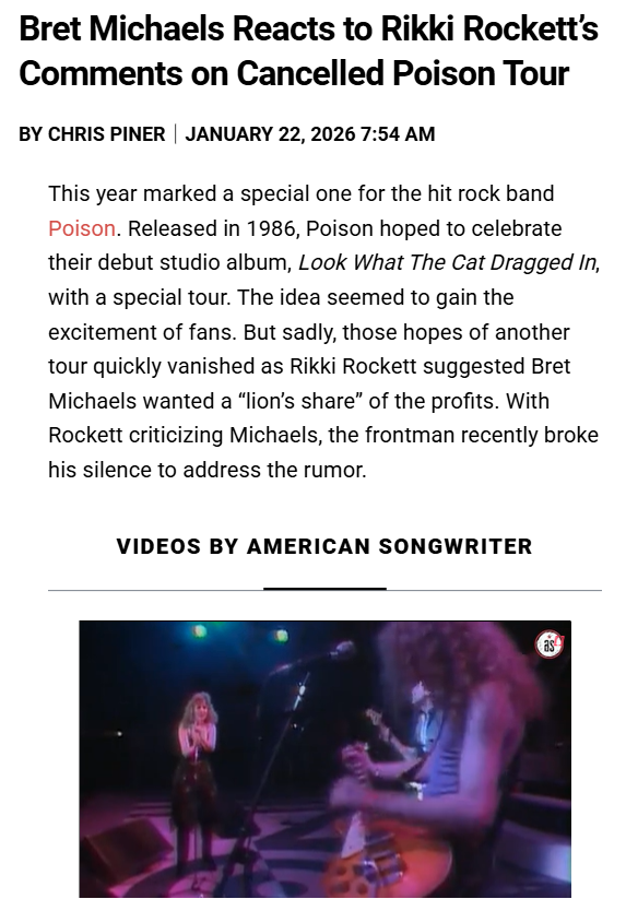 Suzanne Glover+FollowBret vs Rikki: Poison Tour 💥 Money DramaBret Michaels finally clapped back after Rikki Rockett accused him of wanting a bigger cut from the cancelled Poison anniversary tour. Fans are split—some say Bret deserves more as frontman, others blame him for ruining the reunion. With Bret focusing on positivity for 2026, is this the end of Poison or just another band feud that’ll blow over? #Entertainment #Music #PoisonBand00Share