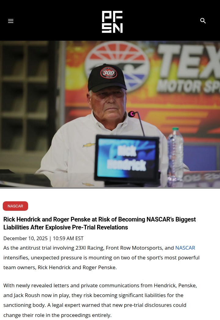 Jeremy Campbell+FollowHendrick & Penske: NASCAR’s Wild Card?Wow, talk about a plot twist! The latest pre-trial bombshells have put The Captain (Roger Penske) and Mr. H (Rick Hendrick) in the hot seat. With their private letters and texts now public, NASCAR’s legal defense could be on shaky ground if these legends take the stand. Insiders say their close ties to Jim France and those charter negotiations might actually hurt NASCAR’s case. Could keeping them off the witness list be the smartest move yet? #Sports #Racing #NASCAR20Share