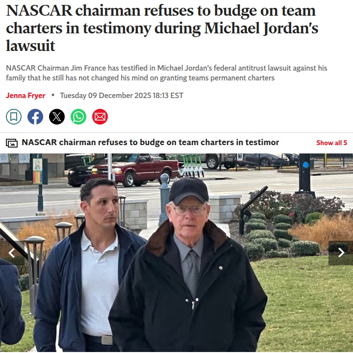 andersonkaren+FollowNASCAR Trial: France Family’s Big RevealWow, today’s NASCAR antitrust trial was a bombshell! Jim France, the big boss himself, took the stand and confirmed he pulls in $3.5M a year and his family owns a whopping 100% of NASCAR. The real kicker? Their trust banked $397M since 2021, though most went to taxes. This is the kind of behind-the-scenes drama fans rarely get to see. With Richard Childress and Steve Phelps also testifying, this feels like a season finale for the sport’s power players! #Sports #NASCAR #JimFrance60Share