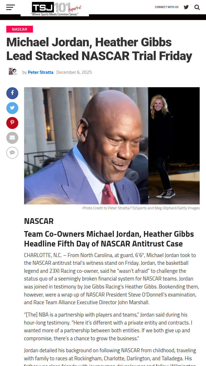 jennifer23+FollowMJ Shakes Up NASCAR’s Power StructureKing Jordan isn’t just changing the game on the court—he’s taking on NASCAR’s financial system too. In Friday’s antitrust trial, MJ and Heather Gibbs went head-to-head with NASCAR brass, calling out the broken charter model and pushing for a fairer revenue split for teams. The real drama? 23XI and JGR challenging the France family’s iron grip, with MJ dropping classic one-liners and Gibbs sharing emotional stories. Is this the rivalry that finally changes NASCAR’s future? #Sports #Racing #NASCAR50Share