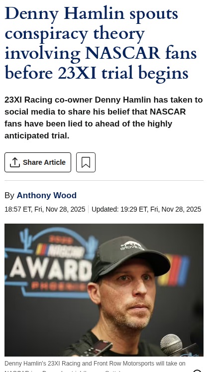 qglover+FollowHamlin vs NASCAR: Charter War Heats UpDenny Hamlin, co-owner of 23XI Racing, is turning up the heat ahead of the antitrust trial against NASCAR, claiming the sport’s fans have been fed a one-sided narrative for years. With MJ himself (Michael Jordan) backing 23XI, Hamlin’s latest social media outburst accuses NASCAR of propaganda and promises the 'truth will out' when the trial starts. Is this the shakeup stock car racing needs, or just more drama in the garage? #Sports #Racing #NASCAR21Share