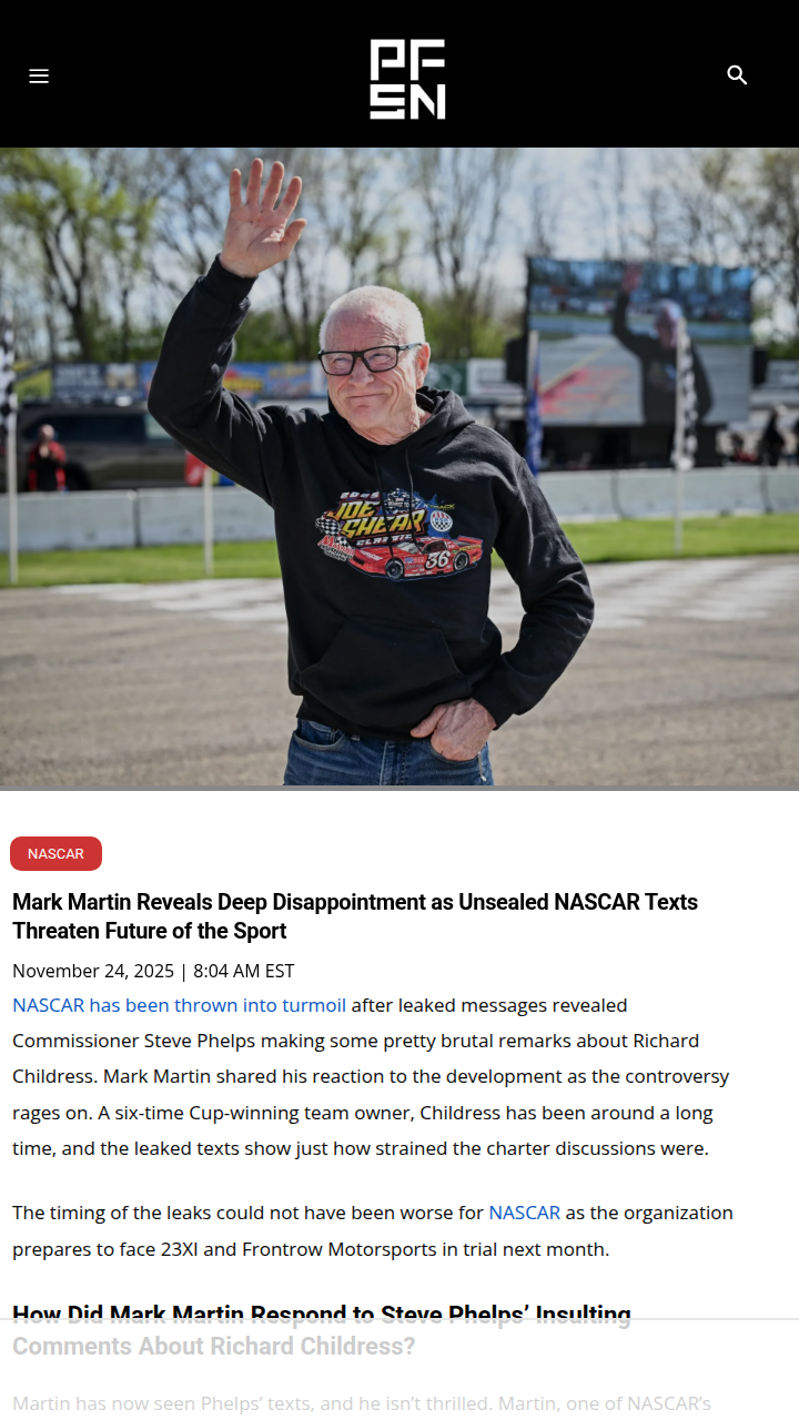 Roger Franco+FollowNASCAR Drama: Mark Martin Reacts to Leaked TextsWow, NASCAR fans, things are heating up off the track! Legendary driver Mark Martin just weighed in after those brutal leaked texts from Commissioner Phelps about Richard Childress hit the internet. Martin’s disappointment is clear—he says this kind of drama is hurting the sport he loves. With big names and team owners caught in the crossfire, and the 23XI/Frontrow trial looming, do you think NASCAR can recover from this mess? #Sports #Racing #NASCAR487Share