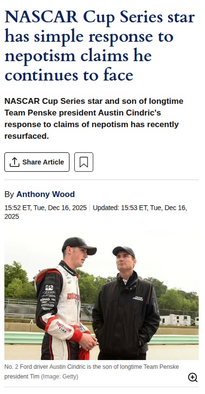 Jason Smith+FollowCindric Fires Back at Nepotism TalkAnyone else tired of the 'Silver Spoon' talk around Austin Cindric? The Penske wheelman just set the record straight, saying his path to the Cup Series wasn't handed to him—even with his dad Tim's big role at Penske. With Tim now out at Penske after the IndyCar controversy, it's clear Austin's seat is about his own wins, not family ties. Thoughts on whether the 'nepo baby' label is fair in NASCAR? #Sports #Racing #NASCAR10Share