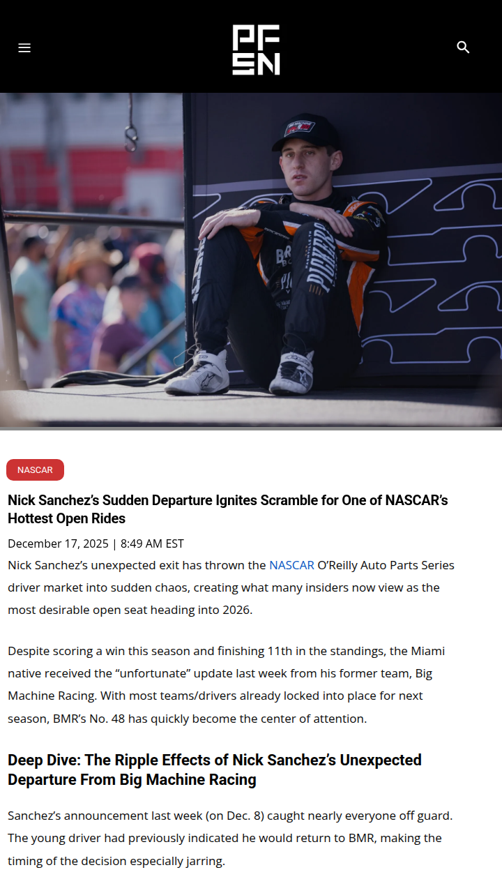 Victor Mathews+FollowWho Grabs BMR’s No. 48 After Sanchez Shocks?Wow, didn’t see this coming! Nick Sanchez, fresh off a win and a solid 11th in the standings, is out at Big Machine Racing for 2026. The Miami kid’s exit has turned the No. 48 into the hottest ticket in the O’Reilly Auto Parts Series. With most top drivers locked in, who do you think steps up—will it be a Truck Series up-and-comer or a Cup Series vet like Almirola? Let’s hear your picks! #Sports #Racing #NASCAR10Share