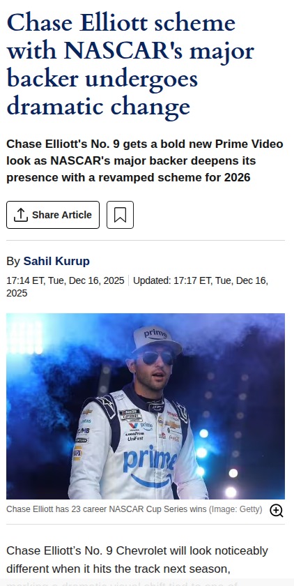 Victor Mathews+FollowChase Elliott’s No. 9 Gets Prime MakeoverBig news for the No. 9 fans—Chase Elliott’s Chevy is getting a bold new look thanks to Amazon Prime Video’s expanded NASCAR partnership. The 2026 scheme ditches the old blue for deeper black accents, making it stand out on the track. With Prime Video now a major sponsor and broadcast partner, this isn’t just a paint job—it’s a statement about NASCAR’s future. What do you think of the new style? Will it bring King Elliott more wins? #Sports #Racing #NASCAR20Share