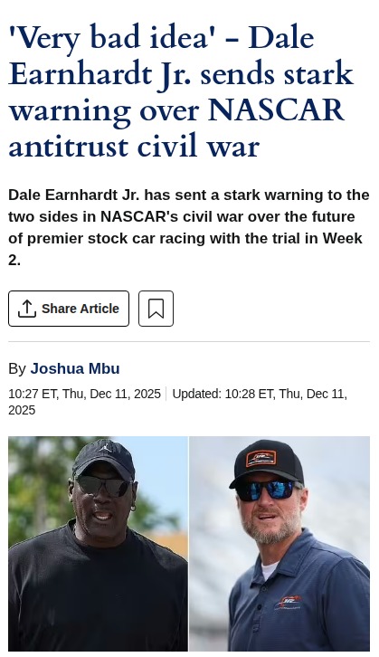 Victor Mathews+FollowDale Jr. Sounds Off on NASCAR Antitrust WarDale Jr. just dropped some serious wisdom on the ongoing NASCAR antitrust battle with 23XI and Front Row. The Intimidator’s son warns that forcing NASCAR to sell its tracks could backfire big time, possibly gutting the sport’s roots. He’s not taking sides, but his take is clear: be careful what you wish for, or we might end up racing in parking lots instead of legendary ovals. Thoughts on Dale Jr.’s warning? #Sports #Racing #NASCAR20Share