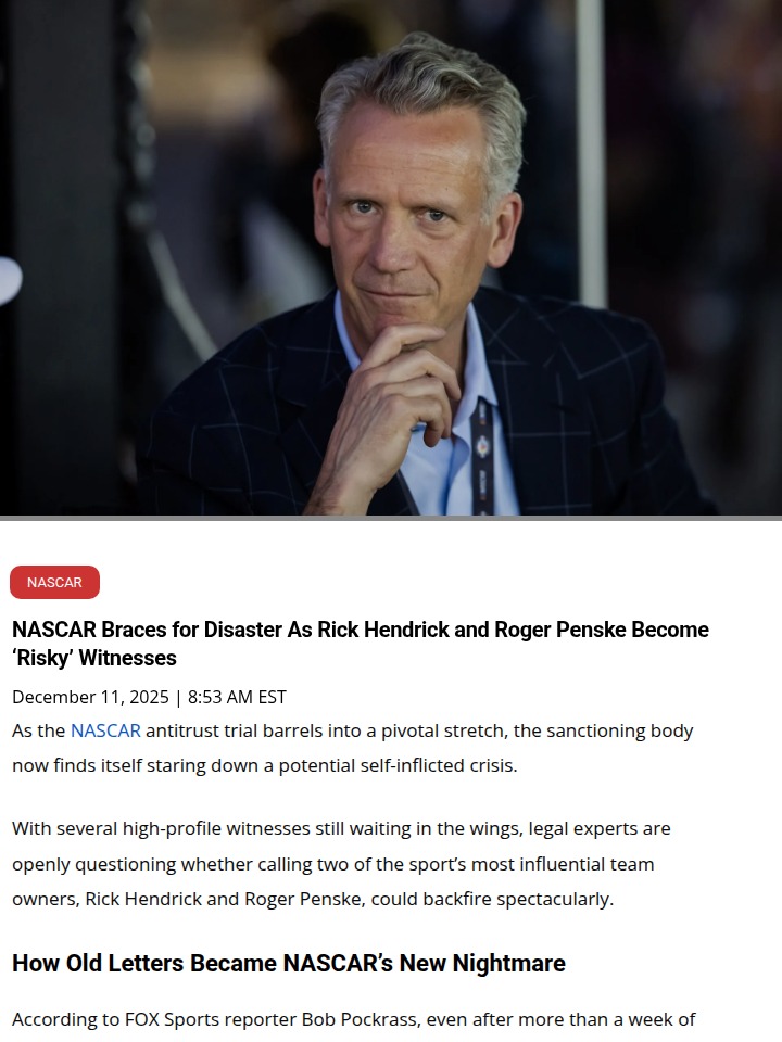 Karla Young+FollowNASCAR’s Trial Gamble: Hendrick & Penske TestifyAll eyes are on NASCAR as the antitrust trial heats up, with Mr. H (Rick Hendrick) and The Captain (Roger Penske) set to take the stand. Legal insiders are buzzing—could their past support for permanent charters clash with NASCAR’s current stance and backfire in court? If their testimony doesn’t line up with old letters, the jury might question their motives. This could be a make-or-break moment for the sport’s power structure. Thoughts on whether NASCAR’s risking too much? #Sports #Racing #NASCAR30Share