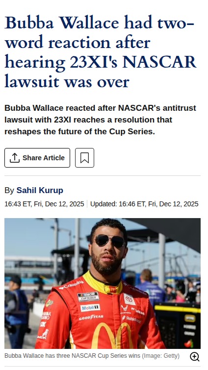 Roger Franco+FollowBubba Wallace Reacts to NASCAR SettlementBig news for 23XI Racing fans! After months of uncertainty, NASCAR and Michael Jordan’s 23XI Racing finally settled their antitrust lawsuit, restoring all three charters and making Cup Series spots permanent. Bubba Wallace, fresh off his Brickyard 400 win, called it a “Monumental day.” With the legal drama over, Bubba and the team can now focus on racing, not courtroom battles. How do you think this will impact the No. 23’s future? #Sports #Racing #NASCAR20Share